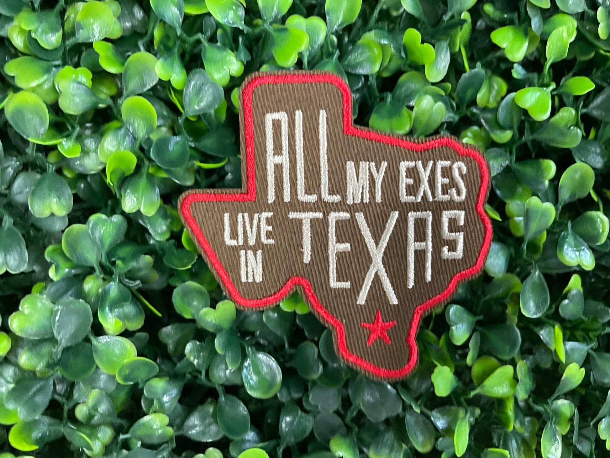 All My Exes Live in Texas embroidered patch, Texas shape iron-on patch, Funny western patch for jackets, Country music embroidered patch, Texas state novelty patch, George Strait song lyric patch, Brown Texas embroidery patch