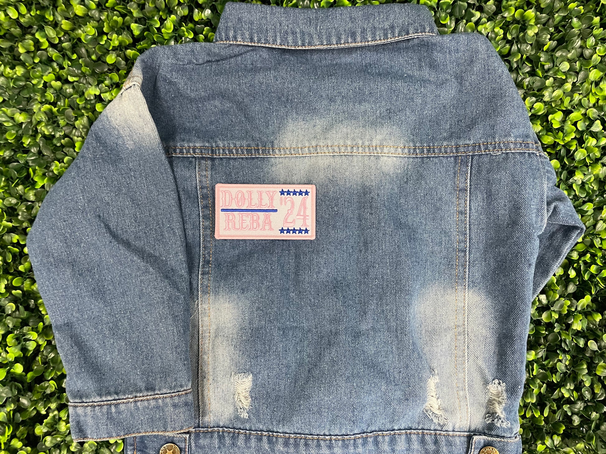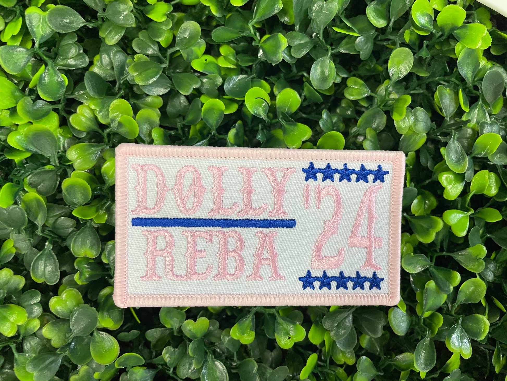This embroidered patch features pink lettering with blue stars that reads “Dolly Reba ‘24,” a fun country music inspired accessory for jackets, bags, or hats.