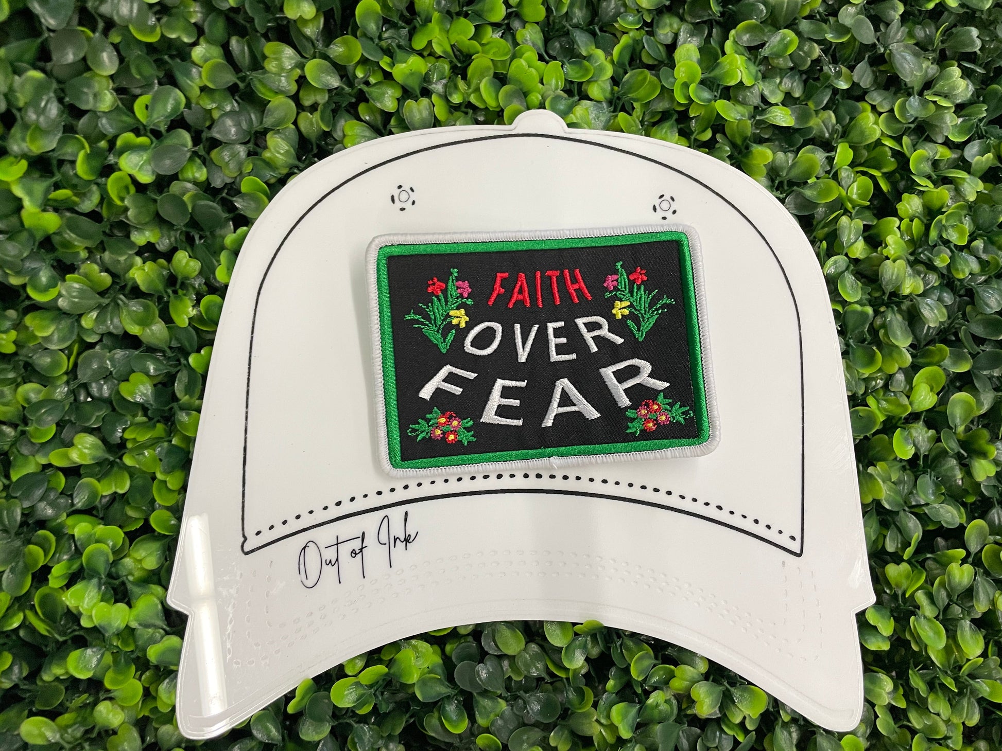 This embroidered patch features the bold phrase "Faith Over Fear" with colorful floral accents, perfect for jackets, bags, or hats.