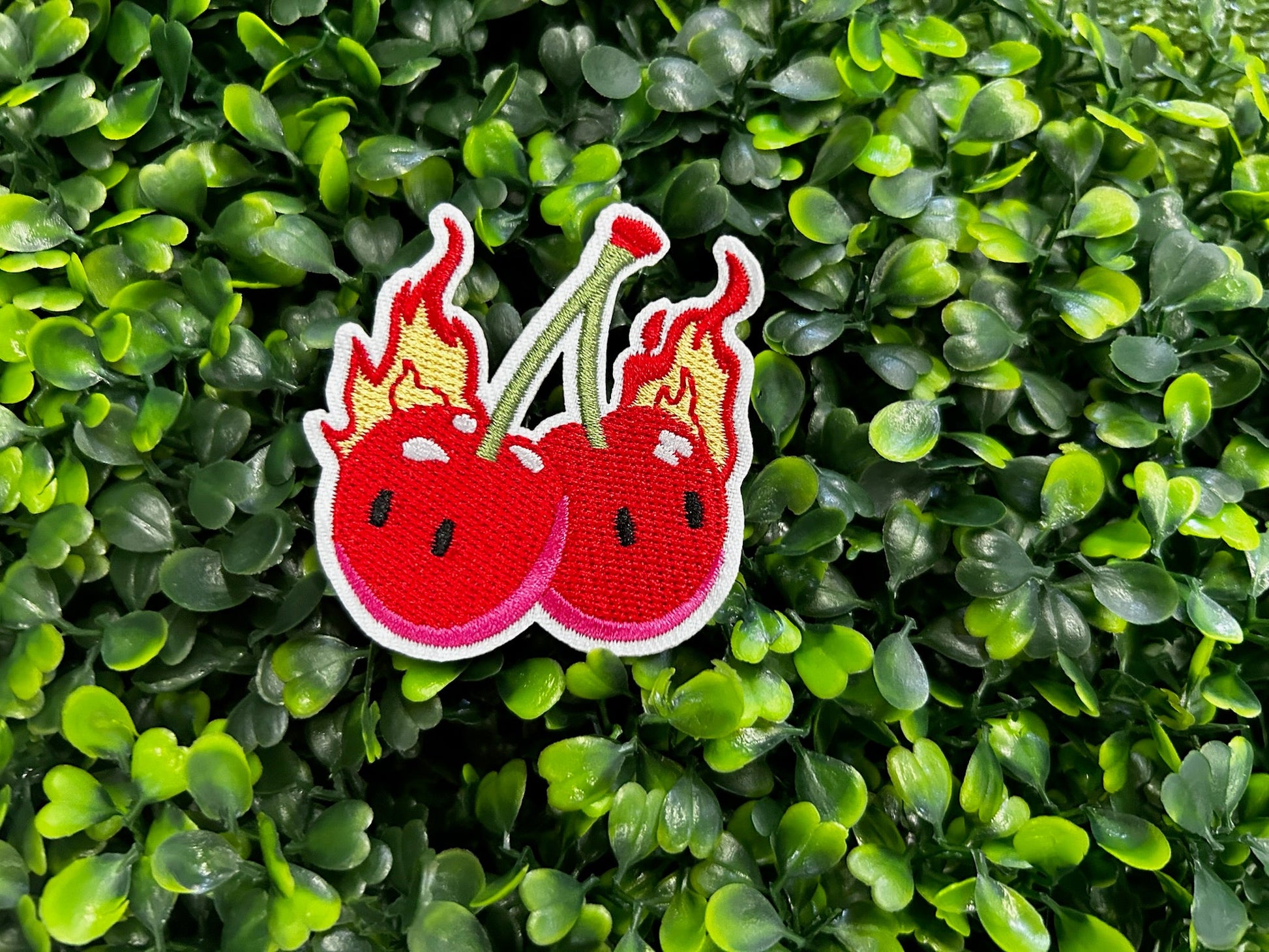 Turn up the heat with this Flaming Cherries embroidered patch! Featuring vibrant red cherries surrounded by fiery flame details, this patch adds a daring, rock-inspired edge to jackets, bags, or hats. Perfect for anyone who loves bold statement pieces and a little touch of rebellion in their style.