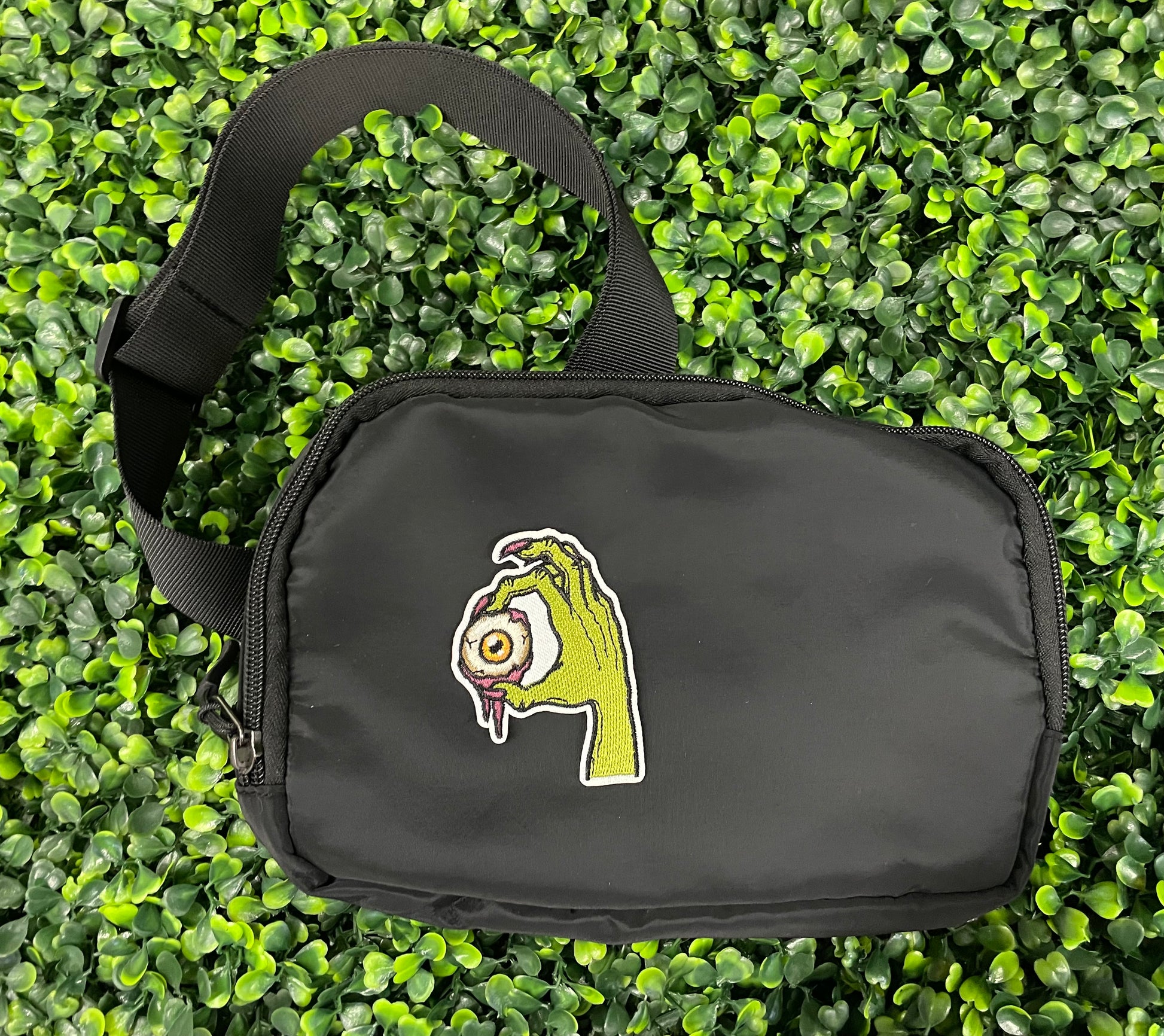 Halloween, monster, eyeball, creepy, spooky, green hand, embroidery, patch, accessory, horror, eerie, stylish, unique, fashion