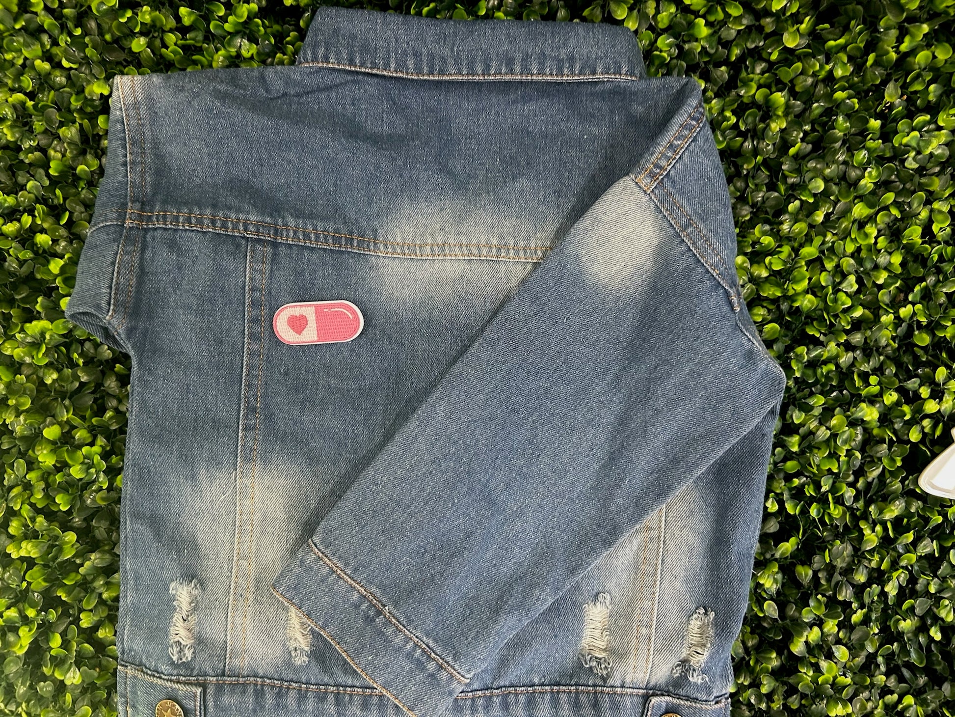 Add a dose of love to your look with this pink Heart Pill embroidered patch!