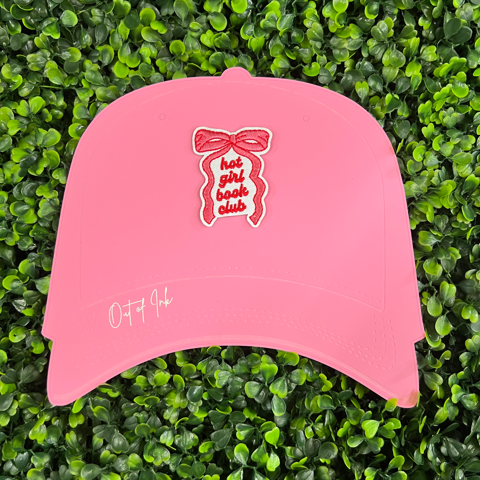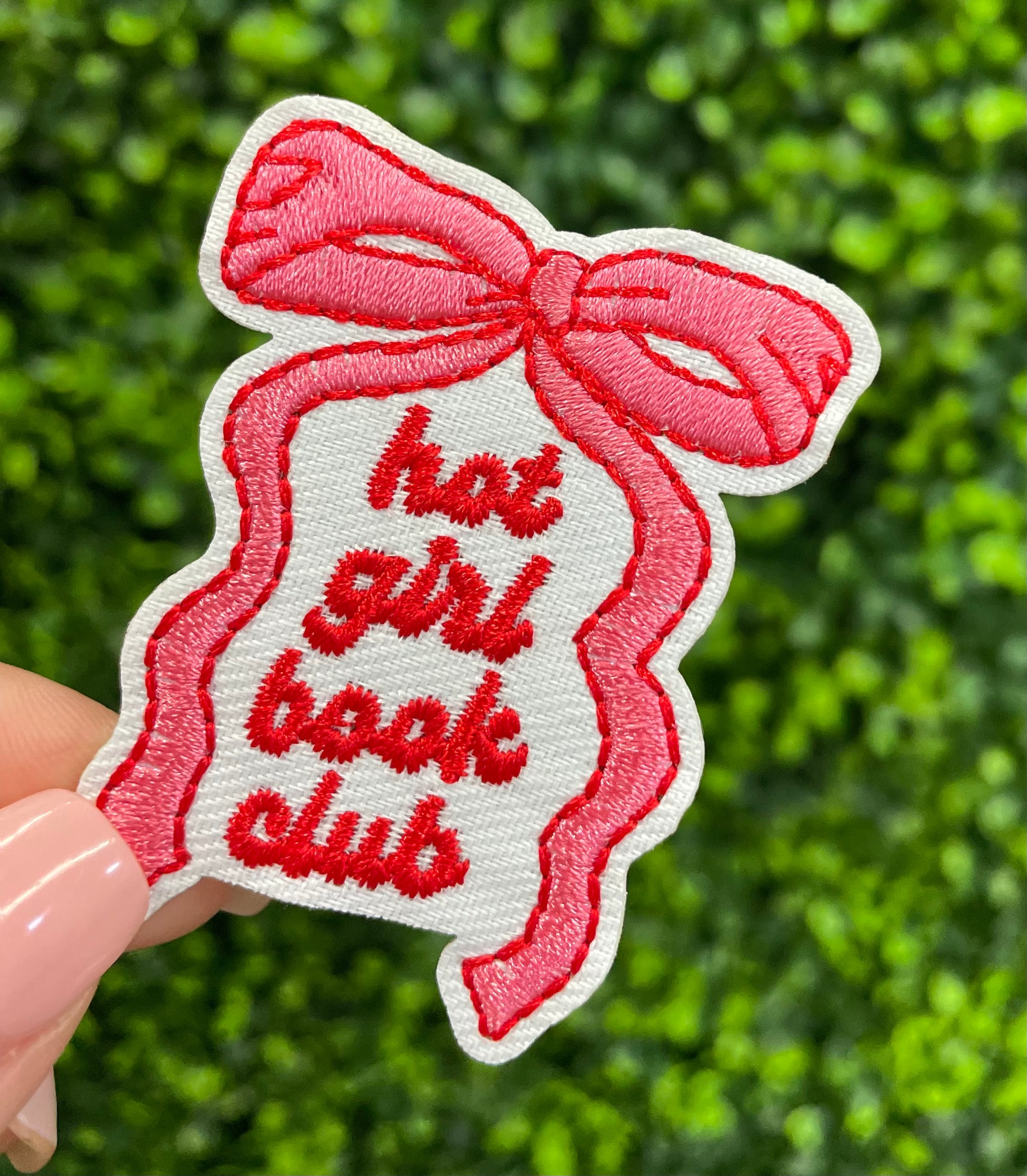 Hot Girl Book Club embroidered patch, coquette bow iron-on patch, aesthetic book lover patch, pink bow embroidered patch, bookish gift embroidery patch, trendy girl embroidered patch, book club iron-on patch