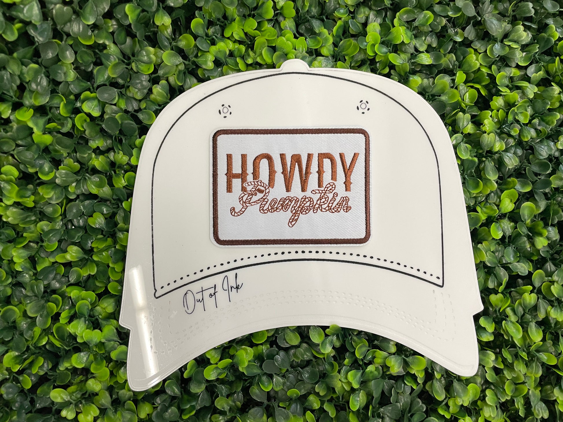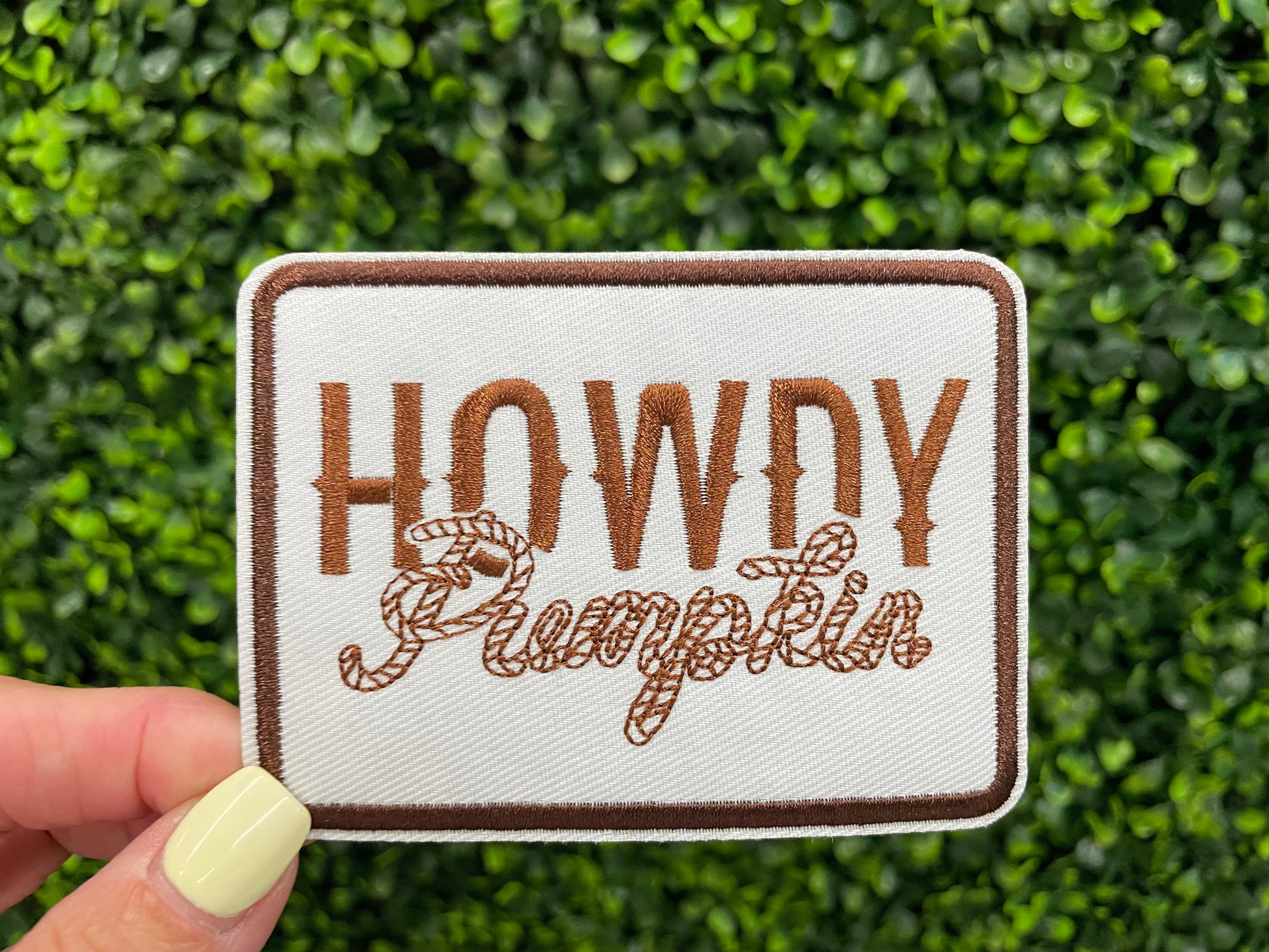 This embroidered patch features the phrase “Howdy Pumpkin” in rustic brown lettering with rope detail, a perfect western fall accessory.