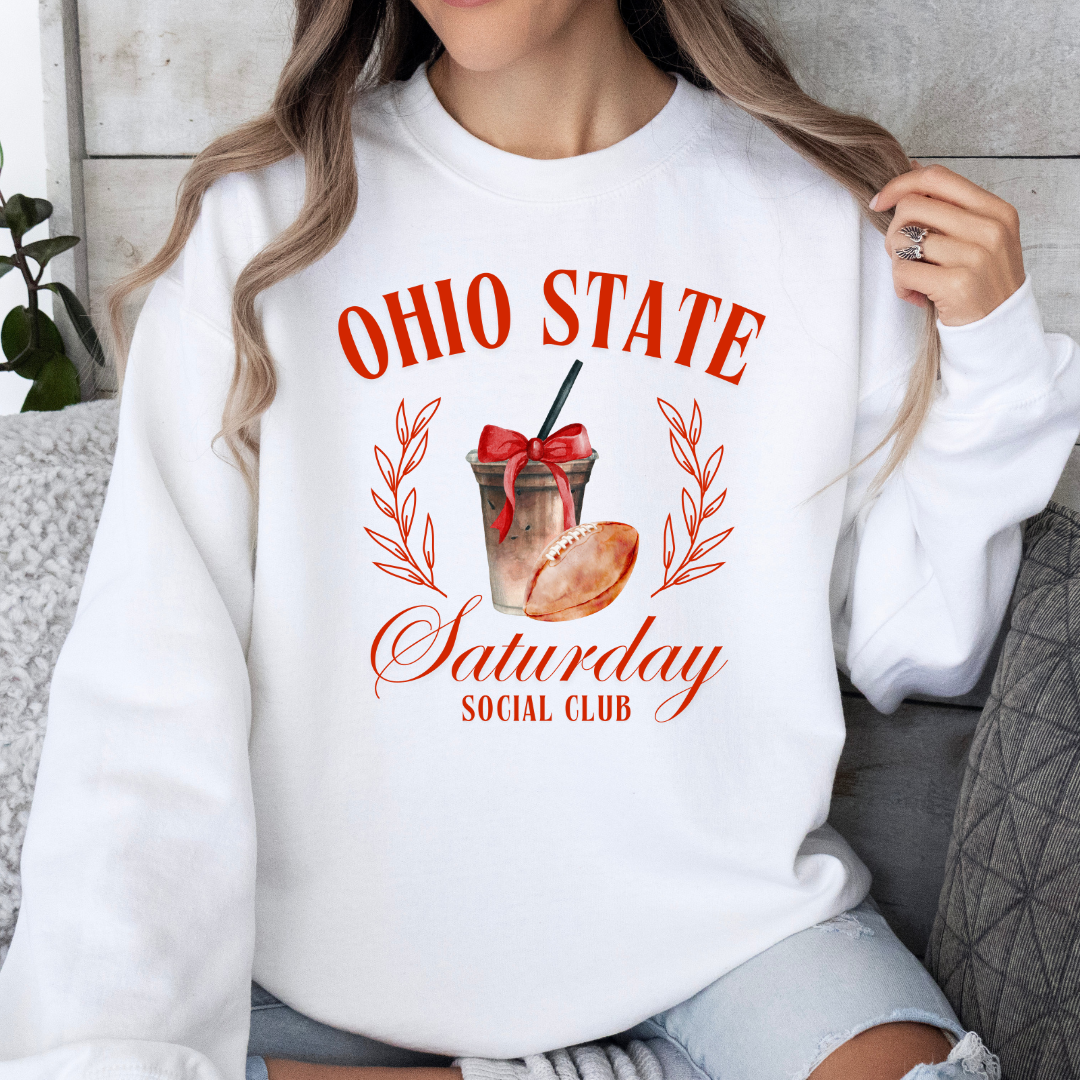 Keep it chic and cozy on game day with our Ohio State Saturday Social Club Sweatshirt. This design features bold Ohio State lettering paired with classic laurel details and a cocktail graphic for a sophisticated yet playful touch. Perfect for game days or social gatherings, this sweatshirt combines fashion with fandom.