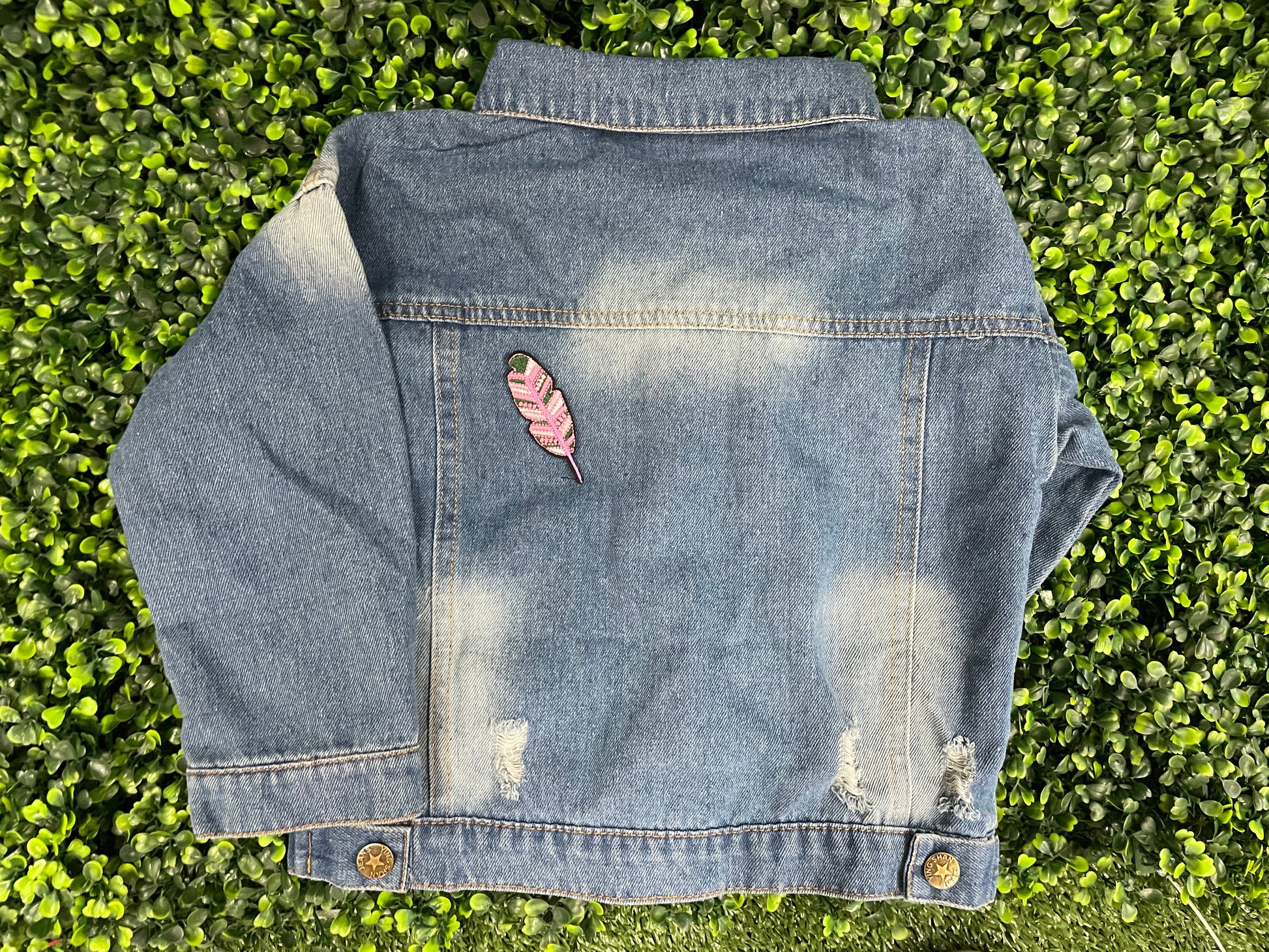 This embroidered patch features a detailed pink and green feather design, a stylish nature-inspired accent for jackets, bags, or hats.