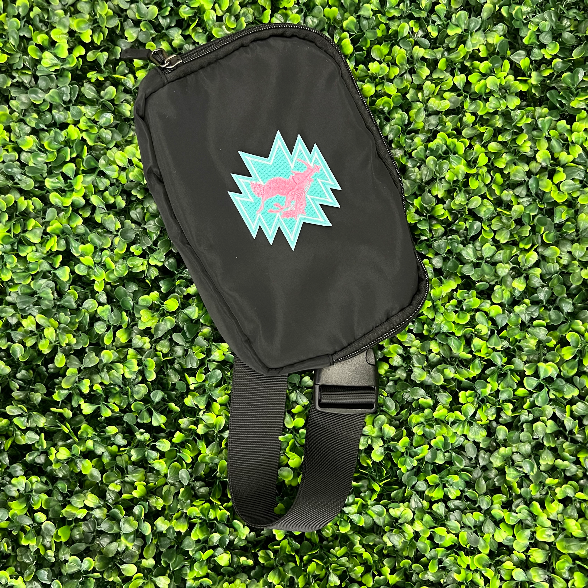 Bring bold western vibes to your style with this striking embroidered patch! Featuring a pink silhouette of a cowboy riding a bucking horse, set against a turquoise starburst background with silver edging, this patch makes a statement wherever you place it.