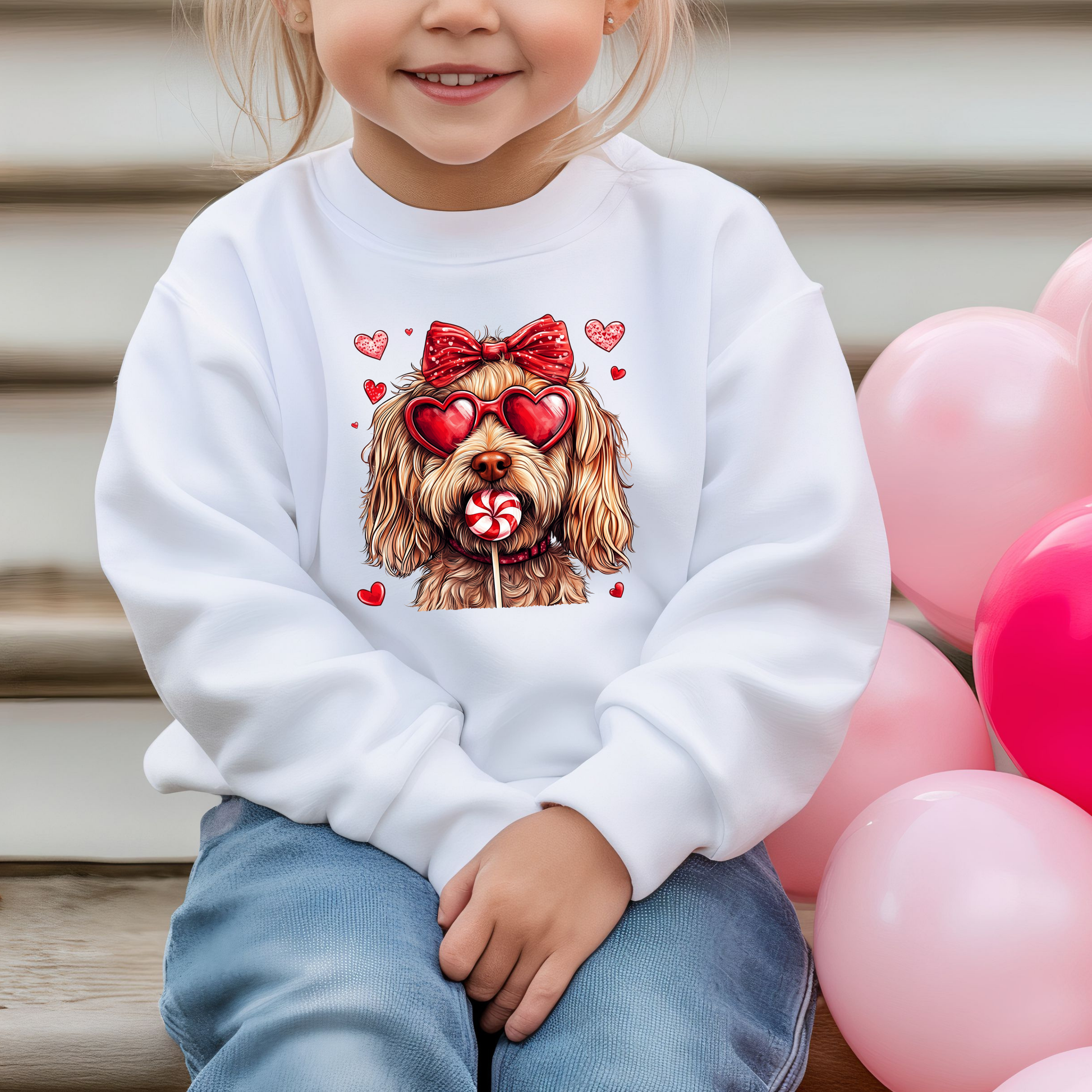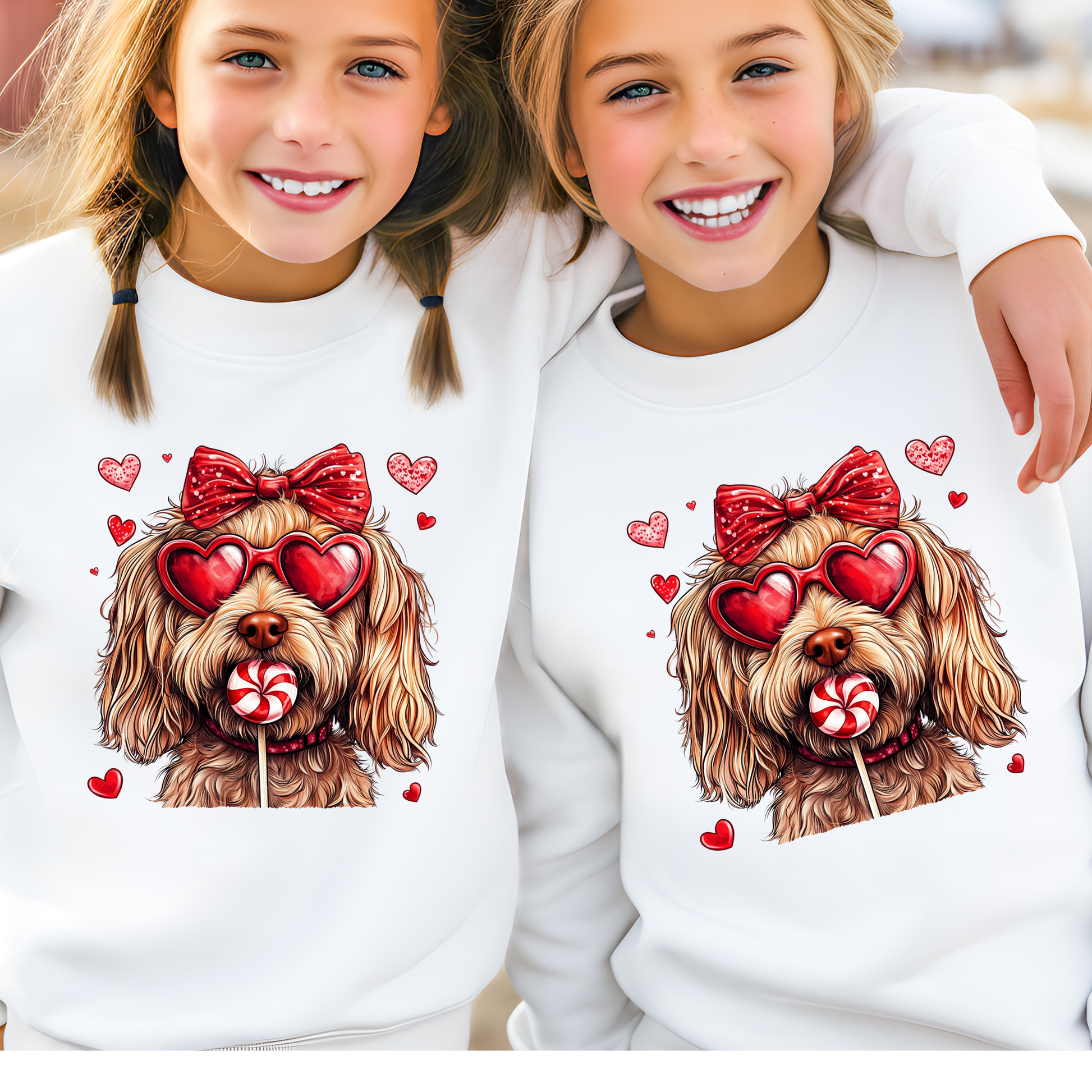 Keep your little one cozy and stylish this Valentine’s Day with our "Puppy Love" Kids Sweatshirt! Featuring a lovable puppy rocking red heart-shaped sunglasses, a glittery red bow, and a sweet lollipop, this sweatshirt is full of festive charm. Surrounded by playful red hearts, this design is the perfect way to celebrate love and cuteness all in one.