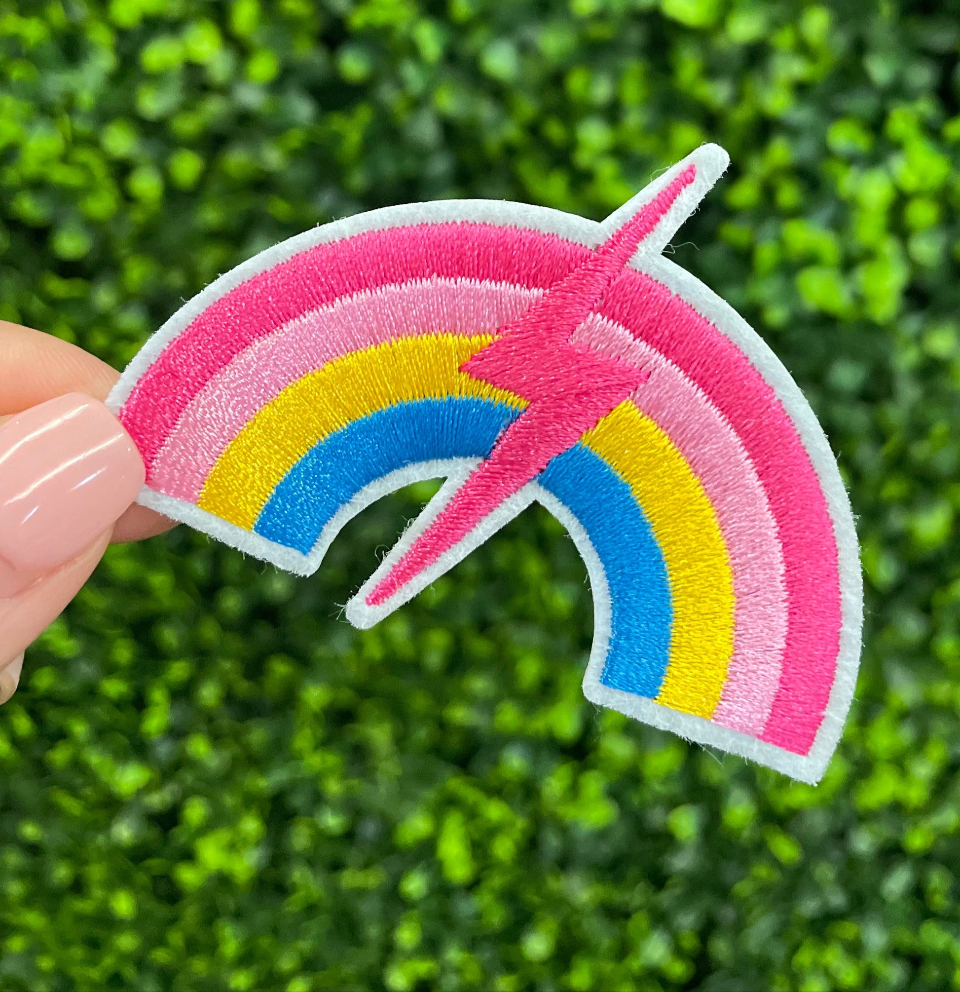 Bright, bold, and full of energy. This embroidered patch features a vibrant rainbow in shades of pink, yellow, and blue, struck through with a powerful pink lightning bolt. A playful mix of sweet and edgy, this patch is perfect for anyone who loves colorful, standout accessories.