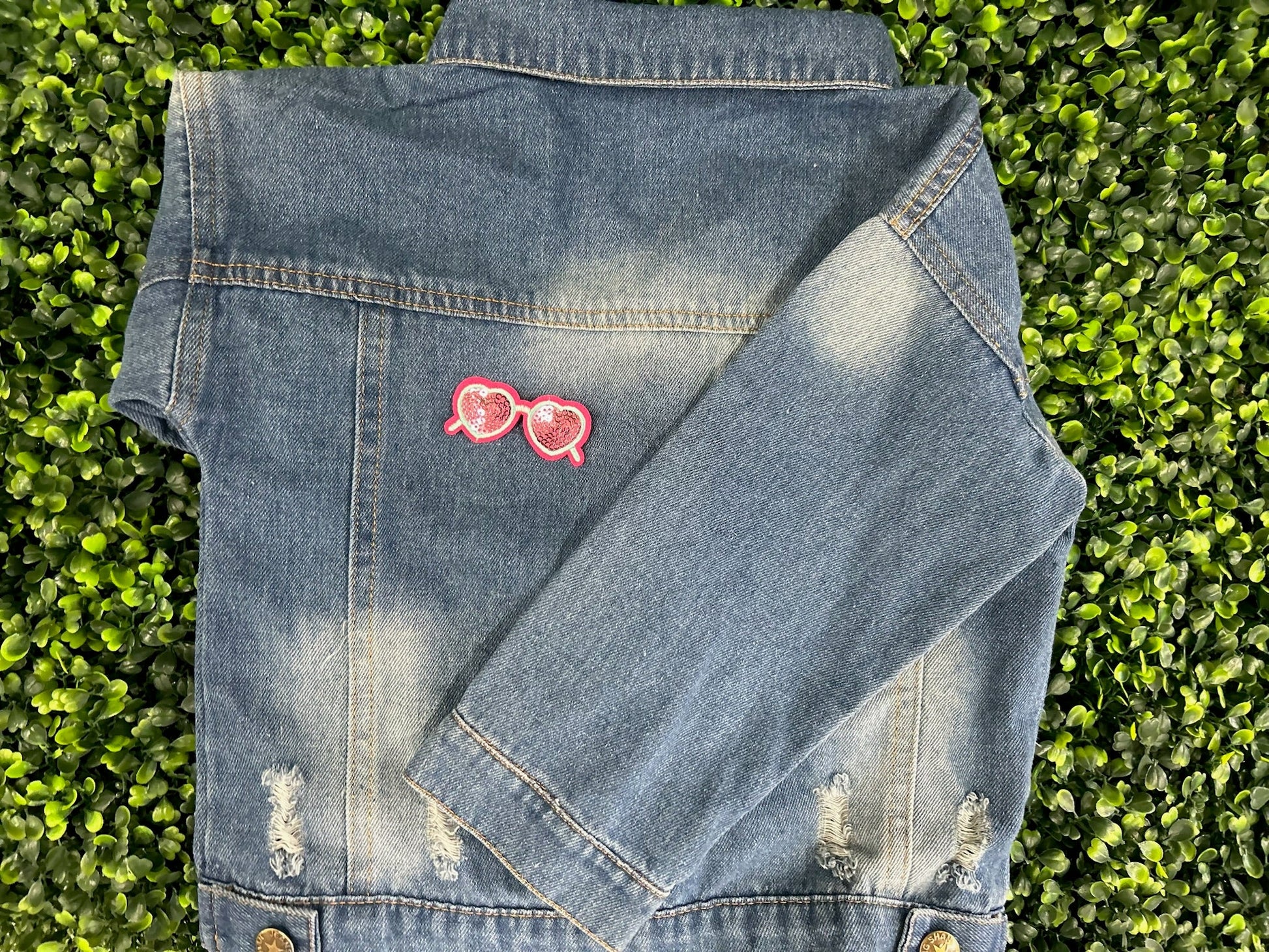 Sparkly heart shaped shades with hot pink frames and shimmering sequin lenses. A playful pop for jackets, backpacks, hats, or festival looks.