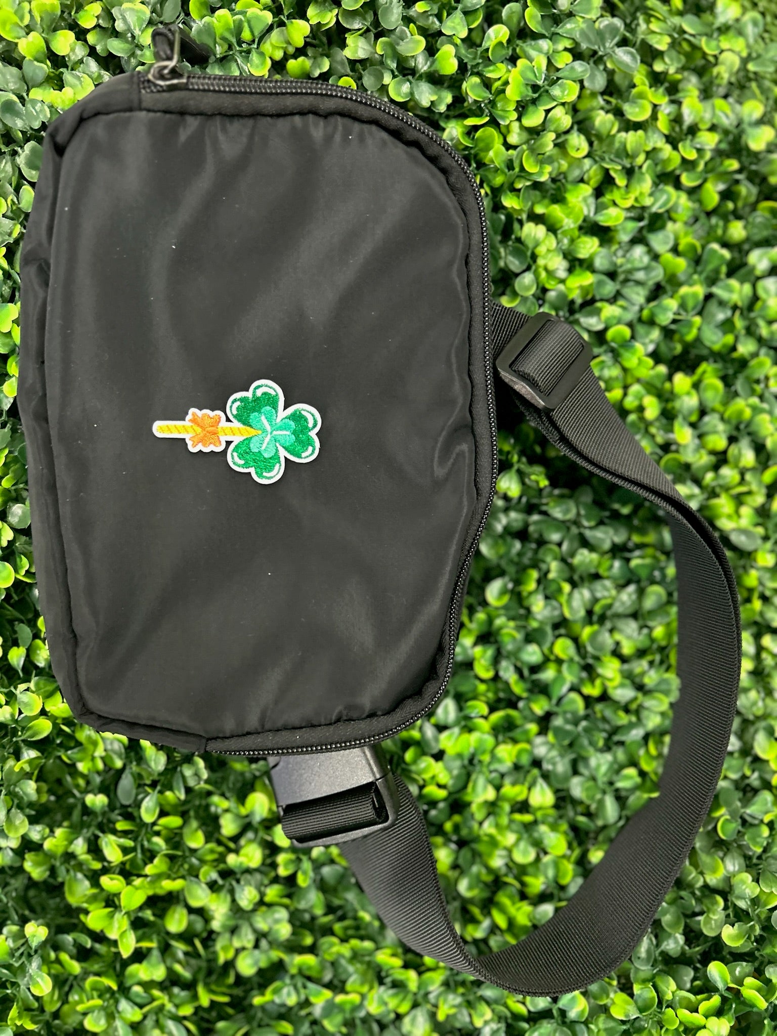 A green three leaf clover sits atop a yellow striped wand with a small orange bow, finished with a clean white border. A cute accent for St Patricks outfits, jackets, backpacks, or craft projects.