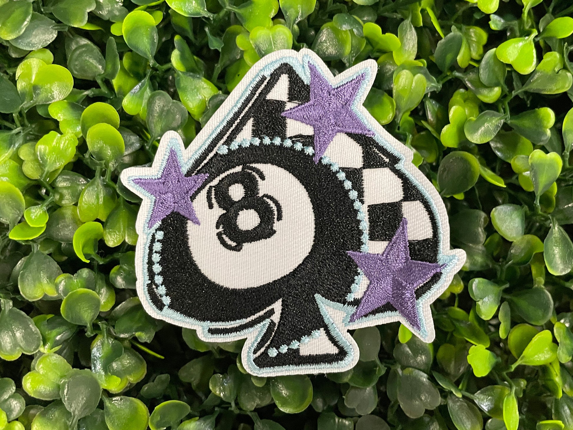 This embroidered patch features a bold black and white checkered spade with an 8 ball center, accented by purple stars for a unique statement look.