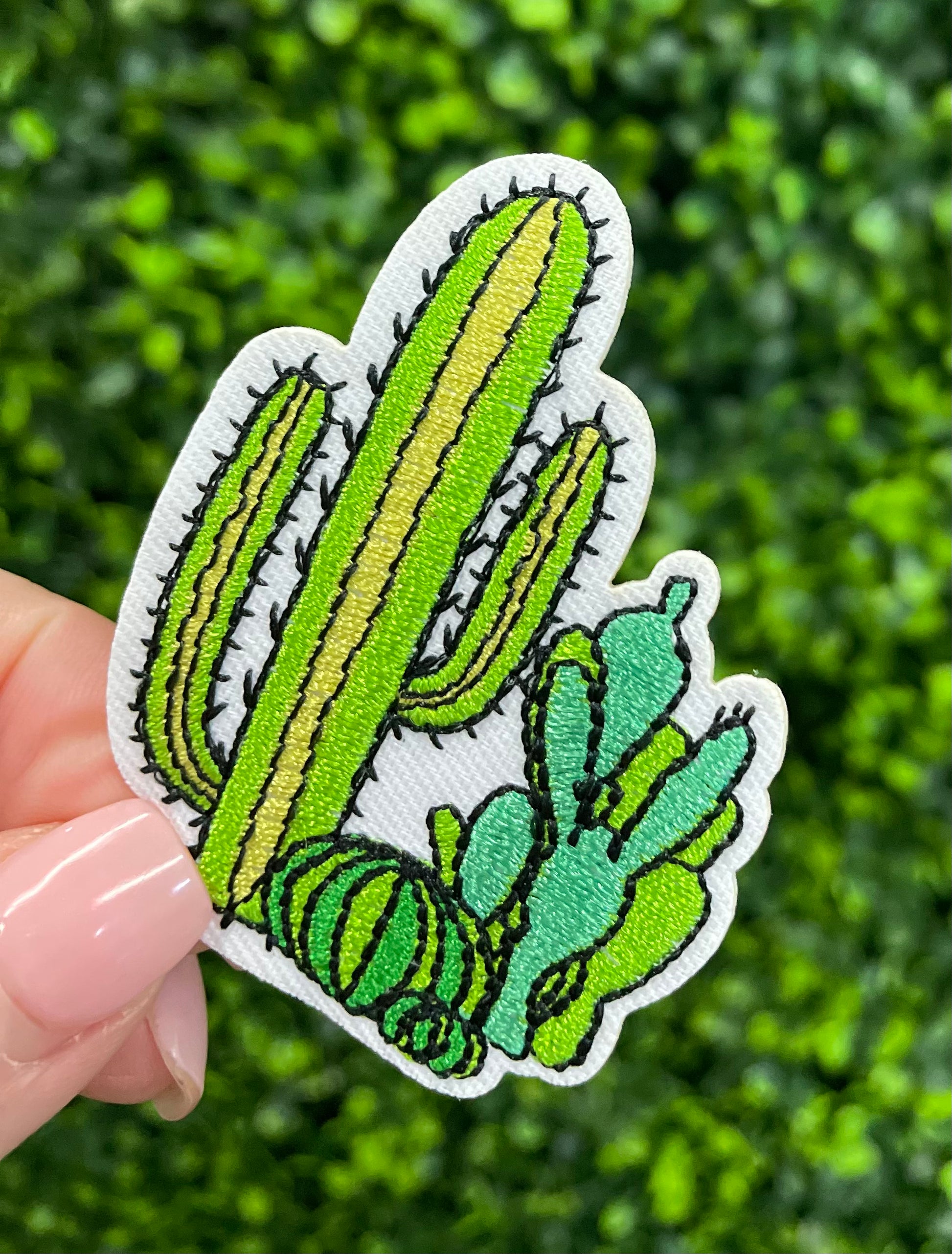 Bring a touch of the desert to your style with this vibrant cactus embroidered patch! Featuring a cluster of green cacti in bold shades of lime and emerald with black detailing, this patch is perfect for adding a western, boho, or outdoorsy vibe to your gear.