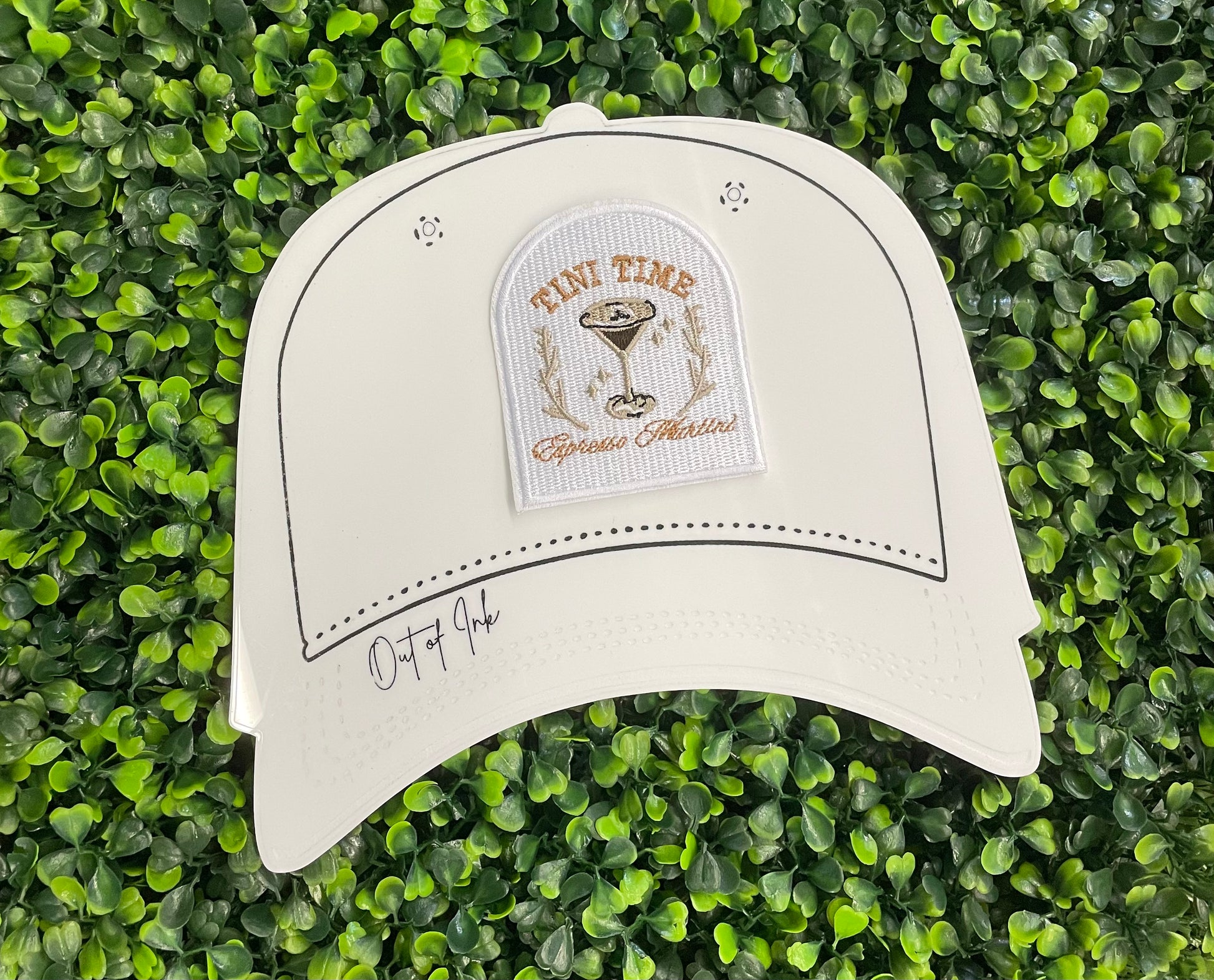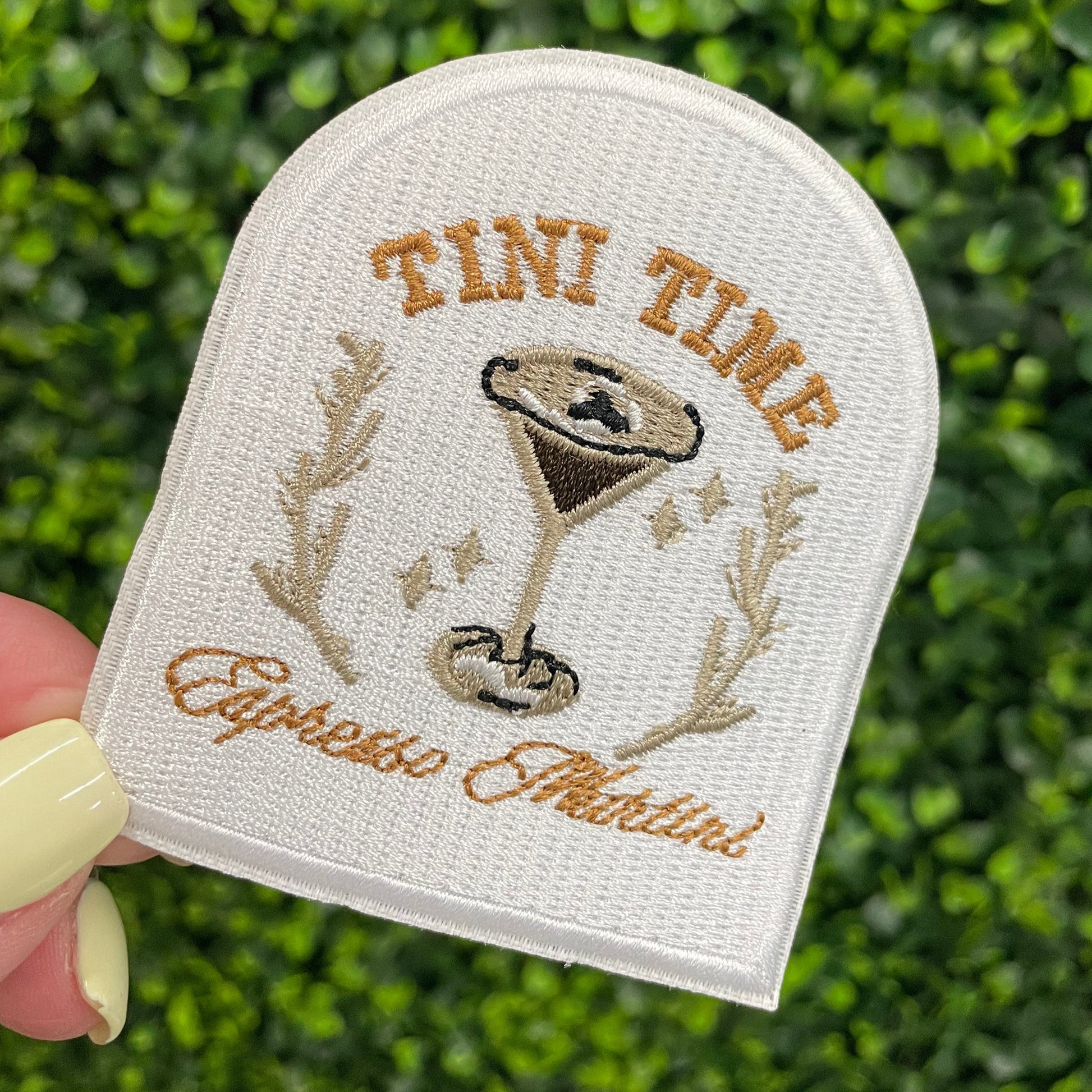This embroidered patch features a martini glass design with the phrase “Tini Time Espresso Martini,” perfect for cocktail and coffee lovers alike.