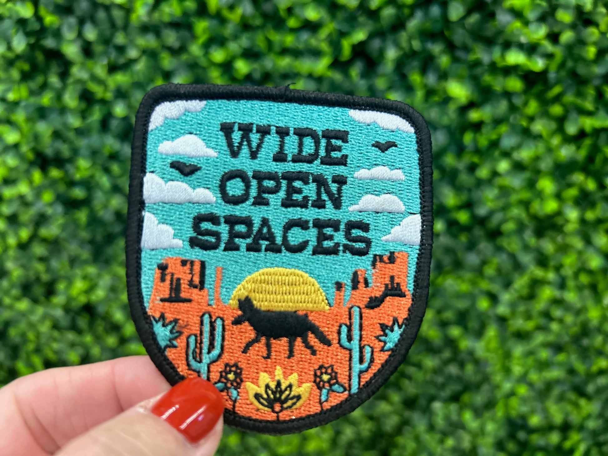 wide open spaces embroidered patch, desert adventure patch, outdoor embroidered patch, western iron on patch, hiking embroidered patch, travel iron on patch, boho nature patch, aesthetic adventure patch, scenic embroidered patch, desert aesthetic patch